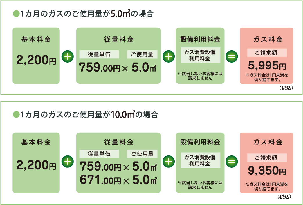 ガス供給設備、建物形態、お住まいの地域、LPガスの用途など、諸条件により料金は異なります。